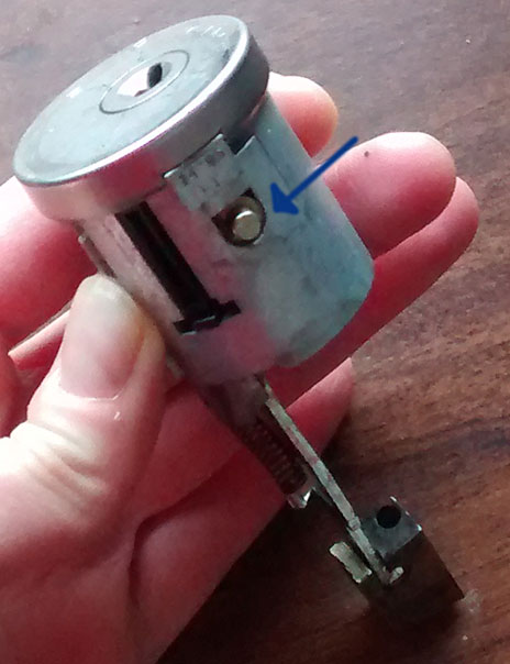 Tiedoston kommentti: Nasta, joka painuu sisään vapauttaen lukon, kun avainta käännetään lukossa.