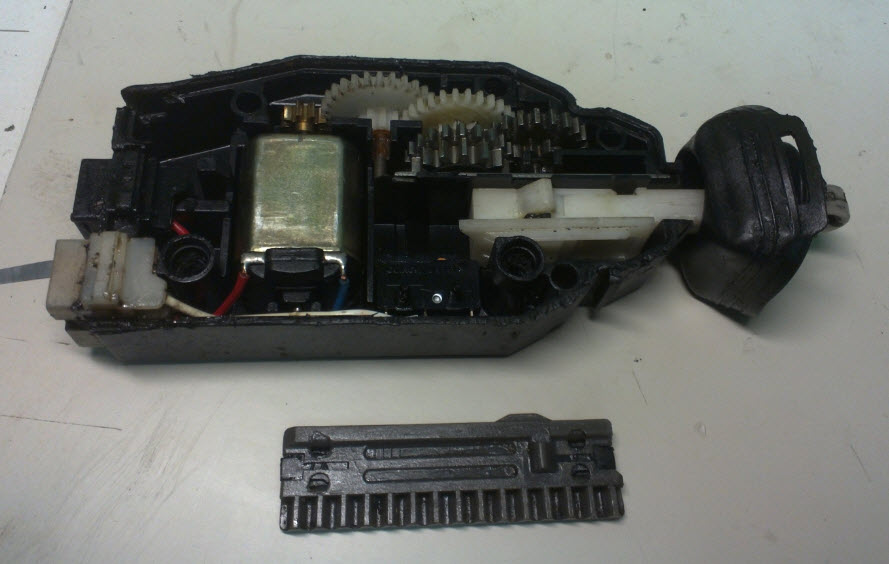 koe kirjoitti: Taidan vielä kerran avata nykyisen (jos ei muuten niin "akateemisesta uteliaisuudesta") ja katsella sitä jousitettua kynttä. Sen on pakko olla jotenkin asian ytimessä. Näyttäisi siltä että moottorin pitäisi jaksaa vetää kynnet toistensa yli siinä vaiheessa kun valkoisesta luistista loppuu liikerata (tai oikeastaan siinä kiinni olevasta lukkovivustosta loppuu). Vaihdoin kevyemmän jousen. Ei auttanut. Kun testasin moottoria irrallaan vaihteistosta niin kävi ilmi että moottori toimii jokseenkin satunnaisesti, jää välillä värisemään paikalleen, välillä antaa savumerkkejä. Avasin sen ja hiilet näyttivät olevan entiset. Joten se siitä ja kauppaan. Uteliaisuus tuli tyydytettyä. K-a-r-i