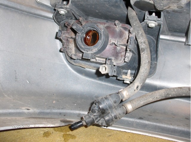 Juuri näin se sitten oli. Ensi kertaa tehtynä vei aikaa, mutta onpahan nyt opiskeltu: säiliön kaula lähtee irti kiertämällä, säiliö itsessään roikkuu rautatangossa. Sumuvaloumpion ruuveista se kauimmainen eli syyläriä lähinnä oleva on todella ahtaassa paikassa - siihen ylettyy pienen hylsysatsin jatkovarsilla & ristinivelellä + 10mm hylsyllä.