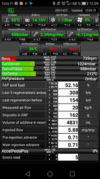 Saattaa se toimiakin. Tuo FAPpressure voisi toimia aika hyvänä indikaattorina FAPin kunnosta. Jos vastapaine on korkea, niin suodatin on tukossa. Mitä tuohon Eolys nesteen vähyyteen tulee, niin olikos se niin, että polttoaineeseen sekoittuva eolys neste sitoutuu paloprosessissa muodostuviin pienhiukkasiin ja myöhemmin hiukkassuodattimen puhdistuksessa alentaa hiukkasten hajoamislämpötilaa. Eli vaikka neste olisi loppu, niin hiukkasten poltto saattaa silti onnistua, vaikkakin huonommin. Voisi myös selittää miksi pönttöön on alkanut kertyä tavaraa. Tämä nyt oli sitten ihan spekulaatiota