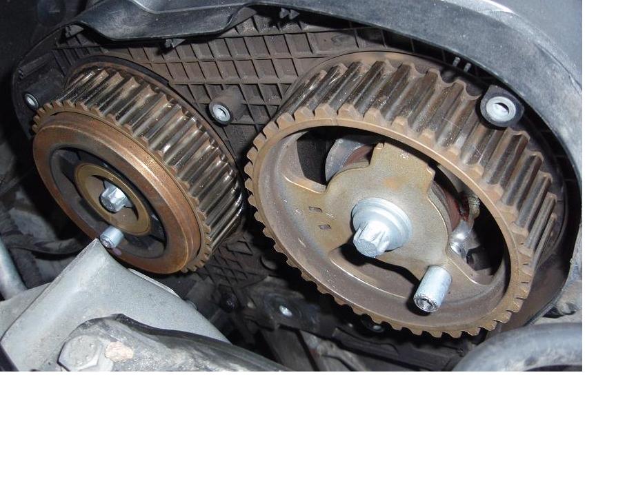 Hihnan asemointi olisi ollut kivutonta, jos olisin löysännyt käyttöpyörän kampiakselilta vapasti kääntyväksi. Tuo ei huvittanut, koska kampiakselin keskiöruuvi olis pitänyt avata tuosta laipasta kiinni pitäen Citroen erikoistyökalulla 6310-T tai sepän tekemällä korvikkeella ;) Ruuvi on myös iso (avain ainakin 27mm, kuvasta) ja luultavasti piukasta, kun kiristysohjeeksi annetaan 40Nm + 40 astetta tykö. Hihnapyöriä ei tullut mieleenkään irrottaa, kun nokka-akselien ajoitus on nimenomaan niistä määrätty. Irrotukseen tarvitaan myös kohtuullinen Torx-hylsy, ks. kuva ja konstit pitää nokka-akseli paikoillaan. Haynesistä näyttäisi siltä, että pyörät ovat yhtä puuta, mitä nyt pakonokan pyörässä on kuminen keskiö värähtelyn vaimennukseen, ja asemoidaan nokka-akselin päässä oleviin koloihin. Pakonokan pyörän ajoitusreikä oli lisäksi väljä (pitkä), joten hihna meni helposti nokka-akselien pyörille, ks. kuva. Lisäksi arvelin, että uuden hihnan tulee sopia paikoilleen pyöriin koskematta, kun kerran vanhakin oli; Hampaita oli samat 157 samalla jaolla ja ainoastaan hampaiden kuluneisuus teki vanhasta hiukan löysemmän.