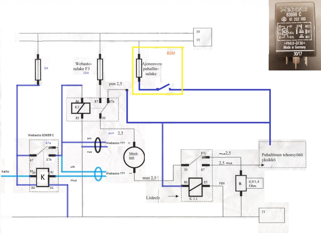 Käsittääkseni se vieressä oleva tavallinen rele on puhaltimelle. Tuosta on kärähtänyt tuo 25A sulakekanta ja tällä hetkellä ei puhallin pyöri kun webasto on käynnissä ja piuha sulakkeelta menee tavalliselle releelle.
