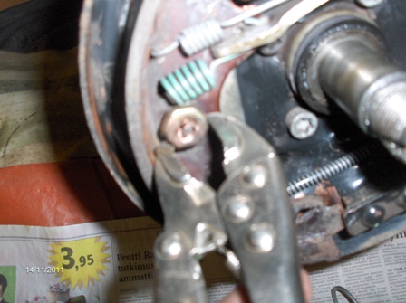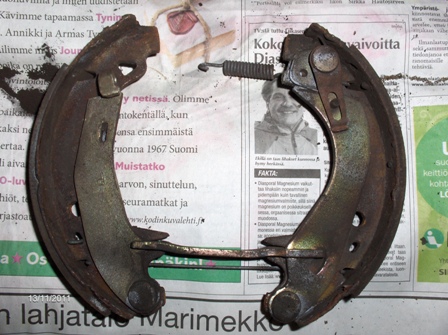 Mutta voi voi, olenko ymmärtänyt jotain väärin, vai onko kenkiä kiinni pitävät "rautalaula"-jousi-alumiinilevyhässäkässä joku niksi irrottaa/kiinnittä helposti, jota minä en keksinyt? Aika mahdoton systeemi yksin asennella. Säätyykö kenkien etäisyys alaosan ruuveilla ulkopuolelta? Nyt homma on purettu ja osien toiminta alkaa hahmottua. Käsijarruvaijerissa on tosiaan hienohampainen säätöhässäkkä, joka senkin toiminta vaatii sisäistystä. Katsastus pomppasi tod. näk. siihen, että sylinteri oli tihkunut jarrunestettä kengille ja rumpuun, ja pito oli heikko. Täytyy jatkaa huomenissa.
