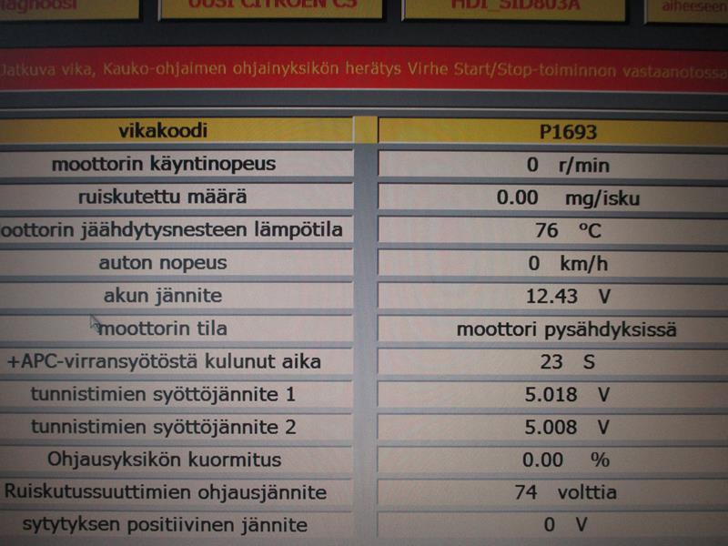 tietokone ja L-ohjelma olisi tuohon tietysti suotavaa saada paikalle, jos on jotain erikoisempaa, mm. ruiskupumpun paineen tallennustarvetta tms. Ruiskupumpun paineensäädin voi laueta, jonka jälkeen ei välttämättä synny käyntiin tarvittavaa painetta. Vaihdoin ko. osan, mutta en muista mitä kaikkia ilmoituksia mahdollisesti asiasta tulee. Toisaalta pitäisi varmaan näkyä tavallisilla lukulaitteillakin ko. vikakoodi.