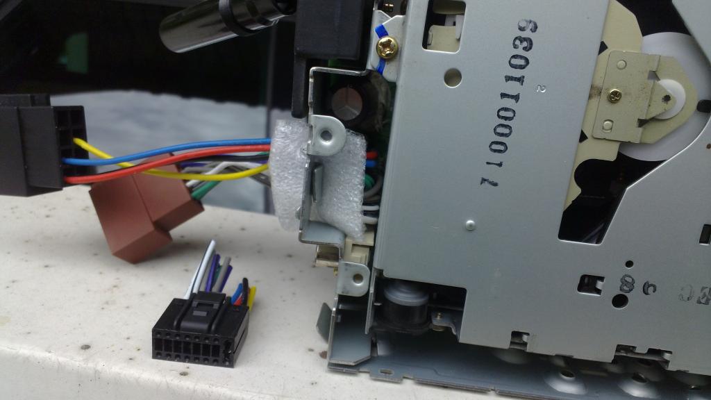 Kun en parempaakaan ideaa keksinyt niin järsin dremelillä radiosta liittimen yläosan irti ja kolvilla jalat irti piirilevystä. Liittimen rungon alapuoliskon jätin koska siinä on 10A sulake. Sitten ISO-Kenwood kaapeli poikki ja juottamalla piuhat kiinni suoraan radion piirilevyyn. Radio piti purkaa, piirilevy irti. Olipahan helmeilevää tinaa (hölmöilevä kolvari), meinasi usko loppua. Mutta nyt on taas stereokuva kohdillaan.