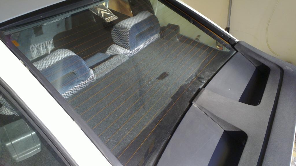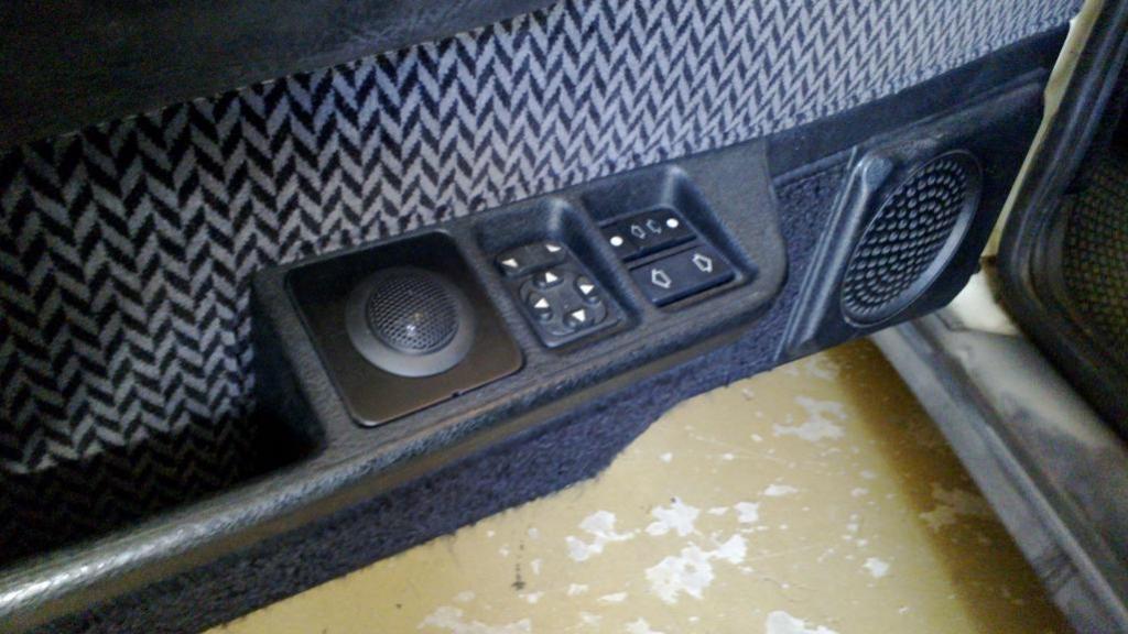 Ei nyt varsinaisesti liity tähän kun räpläsin jo pari vuotta sitten, mutta alkujaan aloin peukaloimaan äänentoistoa koska toisessa takaovessa olemattoman diskantin peittona oleva ritilä oli korvattu tennispallolla. Joten asensin eteen irtodiskantilliset kajarit että sain ritilän taakse. Samoten joku oli laittanut sysirumat kajarit hattuhyllylle. Laitoin hieman paremmat piiloon rätin alle. Viis äänenlaadusta, kunhan näyttää siistiltä. Uusi hattuhyllyn rätti on motonetin verhoiluhuopaa. Siihen ottaa kiinni tarranauhan muovipuoli erittäin hanakasti, joten rätin asennus onnistui vetämällä tarranauhaa hattuhyllyn reunoille.
