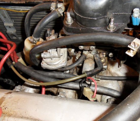 Punajohtoinen pötkylä näyttää samalta kuin bexin weberien sammutussolenoidi eli jälkikäynninestin. Jotain sellaista riesaa siitä oli että kuluneen solenoidin jumittaessa tyhjäkäynti oli huono tai puuttui kokonaan, mutta kaasua polkemalla moottori kävi. Katkaisin siitä karan kokonaan pois ja sitten kävi hyvin, eikä edes jälkikäyntiä ollut. Liekö kuumiin oloihin vai mihin mutta omassa tapauksessani siitä oli vain haittaa. Johtoon tulee sähköt kun virta on päällä.
