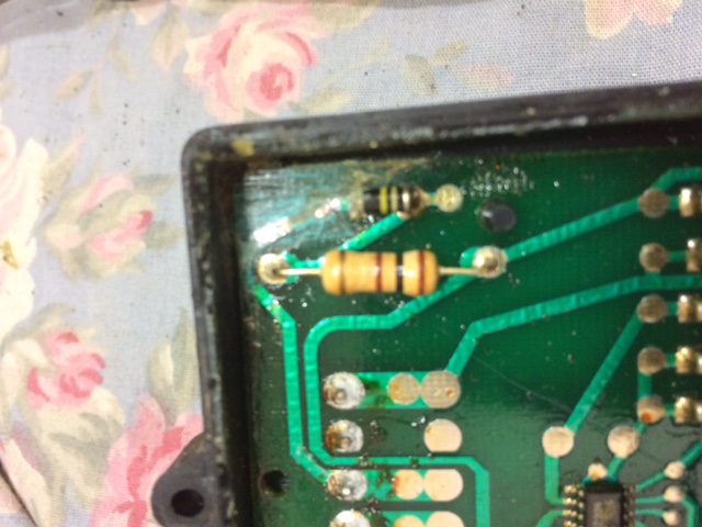 Siinähän on kaksi optosensoria ja niiden välissä liikkuu pyöreä rakolevy. Liikkuminen välittyy vivun kautta kallistuksenvakaajasta. Piirilevyn yhdessä kulmassa oli likaa/kosteutta ja kuten kuvasta näkyy niin siitä oli pätkä kuparifoliota hävinnyt sähkökemiallisen korroosion johdosta. Tuota kautta menee 12v elektroniikalle. On tainnut olla suolavettä koska noin on kuparit siirtyneet jonnekin.
