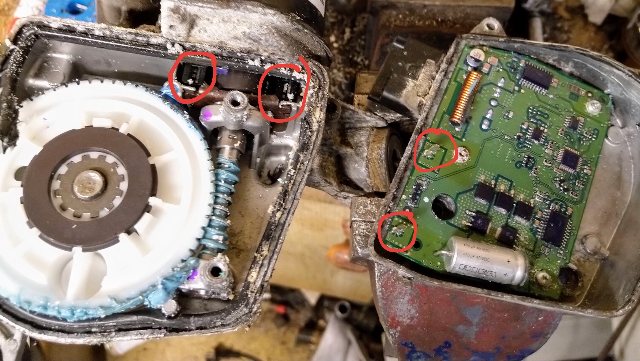 Oma kulkine joutui näissä X7:ssa varsin yleisen pyyhkijäongelman uhriksi. Pyyhkijät alkoivat jumittua yhä yleisemmin satunnaiseen asentoon kesken käytön. Molemmat pysähtyi aina. Vika "nollaantui" vasta muutaman tunnin seisotuksen jälkeen. Vikakoodi FF13 viittasi master moottoriin. Hieman epäselväksi jäi kumpi on master kun monenlaista keskustelua on LHR/RHR autoista ja milloin puhutaan kuskin/apukuskin puoleisesta ja milloin oikeasta/vasemmasta. Moottorien hinnat aika rapeat enkä ihan varma ollut kumpaan pitäisi kiinni käydä, niin päätin aukaista nuo ihan mielenkiinnosta. Moottorien yläpuolella varren ympärillä on muovinen kuori joka pitää sisällään nivelkoneiston. Näissä oli hieman kosteutta, repsikan puollella enempi, mutta ei mitään mikä selittäisi toimimattomuutta, niveltkin hyvin rasvassa. Paketin alapuolella 4:llä ruuvilla kiinnitetyn alumiinikuoren alta löytyi aivot ja kierukkavälitys joka välittää moottorin liikkeen toisen puolen nivelkoneistolle. Repsikan puoleinen (kuvassa) oli saanut paljon kosteutta sisäänsä sähkömoottoria lähinnä olevasta nurkasta silikonitiivisteen antautuessa. Kuskinpuoleinen, joka oli vielä kuiva, oli myös alkanut tiivisteeltään antautua ko. nurkasta. Sinänsä kaikki näytti ehjältä eikä piirilevyn yläpuolella ollut huonoja juotoksia ja levyssä kiitettävän paksu suojalakka. En käynyt levyä irrottamaan kun olisi pitänyt juottaa irti liittimelle kotelon läpi menevät nastat. Uittelin oksidoitunnutta kantta piirilevyineen sitruunahappossa, pesin ja kuivasin uunissa. Suihkutelin uutta piirilevylakkaa levyn ja kotelon väliin ajatuksella että suojaisi niitä liittimelle meneviä piikkejä. Moottorin yritin irroittaa, mutta ei lähtenyt ilman väkivaltaa hiilien pistäessä joustavasti vastaan noin 5 mm liikkeellä. En keksinyt miten ne saisi vapautettua. Kommutaattori joka moottorin kotelon puoleisessa päässä tuli kuitenkin näkyviin, eikä uutta hävennyt. Mitään hiilipölymujua ei ollut putsattavaksi. Ainoa mahdollinen vikapaikka (pl ecu) ja selvästi huono design on nuo kuvassa ympyröidyt piirilevystä nousevat piikit joiden kautta virta moottorille kulkee siinä olevien jousikuormitteisten koskettimien kautta. Hieman kuin sulakekannassa. Mitään näkyvää hapettumaa niissäkään ei ollut, ilmeisesti pinnoite hyvin korroosion kestävä, mutta alue oli selvästi vedestä kostea. Niille tein crc contaktin putsauksen ja kevyesti näytin 2000 hiomapaperia ja sipaus akunnaparasvaa pintaan. Vanhojen silikonien putsaus saumoista, kuivaus kuumailmapuhaltimella ja uusilla liimoilla kasaan. Nyt on pyyhkimet toimineen moitteettomasti. Ennen remppaa alkoi jo pysähtyä ekalla pyyhkäisyllä, onneksi olin heti ensimmäisen stopin jälkeen lueskellut kokemuksia ja vaihtanut pesunesteen Voltera Prohon joka toimii kuin Rain-x tyyppiset pinnoitteet. Auttoi paljon ja toisaalta ko jaksolle ei sattunut pahoja räntäsateita tai jäätävää tihkua. Vikoja noissa voi olla varmaan monia ja kosteus helposti voi aiheuttaa noiden ecuihin ehkä pysyvämpääkin vikaa? Omassa tapauksessa kumpikin näytti mekaanisesti luotettavilta rakenteeltaan ja tuskin kulumalla hajoavat. Irrotuksesta/vaihdosta on hyviä videoita, eikä paha rasti ja samalla tulee tehtyä BSI-reset .