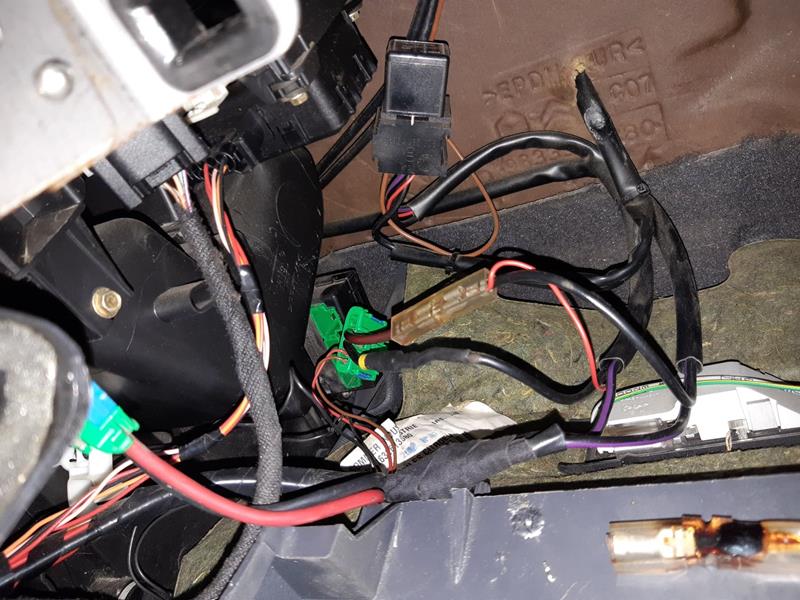 Ota suosiolla hanskalokero pois niin pääset helpommin käsiksi etuvastukseen. Samalla voit katsoa onko johtoliitokset sulaneet siinä lähistöllä, kuten omassani 2003-mallisessa oli. Puhallin voi lakata toimimaan näistä molemmista syistä, mutta nämä eivät kolise vikaantuessaan. Kuva otettu poistetun hanskalokeron kautta. Siinä alareunalla yksi kolmesta kärynneestä liitoksesta.