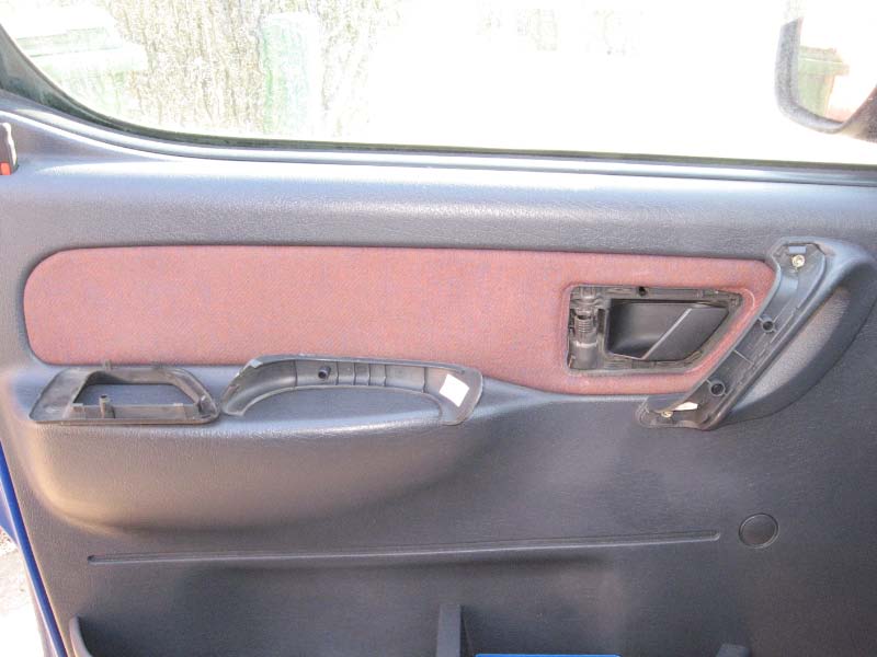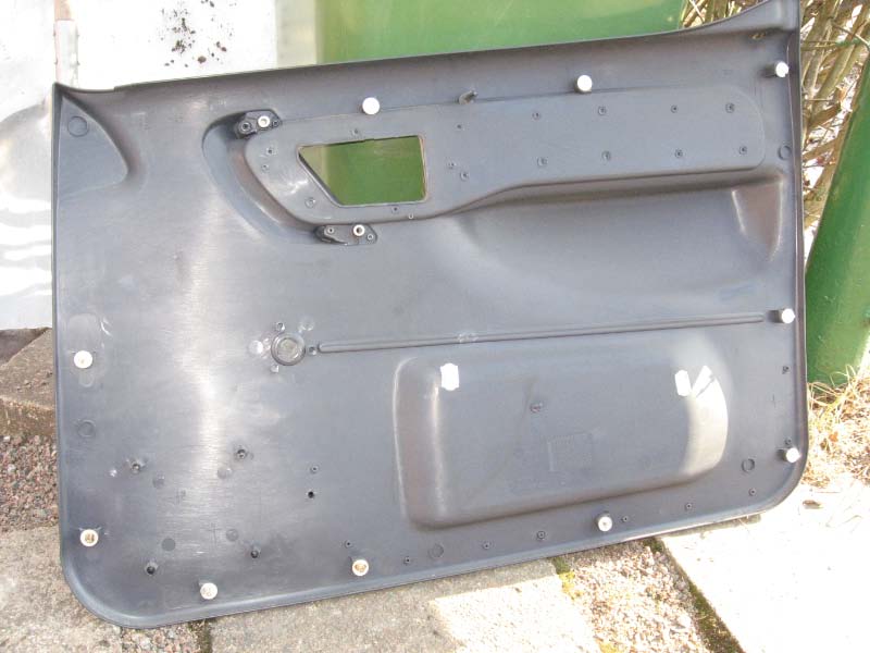 Kahvasta kaksi ruuvia auki ja sitten ovipaneeli kammetaan varovasti irti reunoja myöten, esim leveällä taltalla. Muoviset kiinnitysnastat säilyivät kaikki ehjinä.