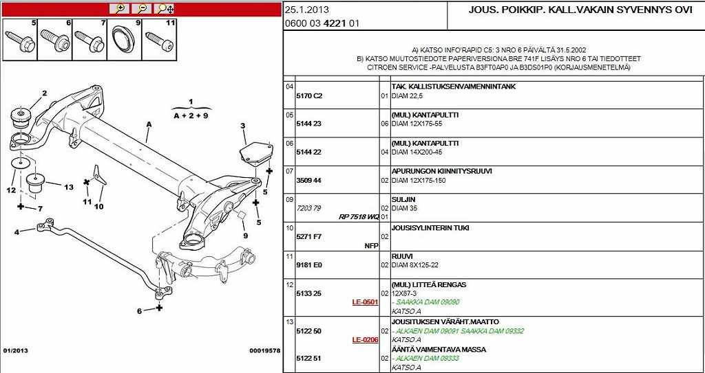 C5 I:ssä vaihdettiin RP 9606 (26.2.2003) alkaen kolahtelun takia takakelkan kiinnityspultit pidemmiksi 35->55mm ja niiden kiristysmomentti 85->90Nm:iin. Pitemmät pultit voinee vaihtaa vanhempiinkin.
