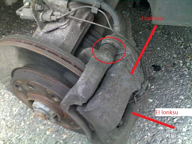 Päivitystä tilanteeseen  Huomasin oikeaa eturatasta voimakkaasti heiluttaessa (poikkisuunnassa autoon nähden) että se siellä jossain on väljys (no shit sherlock). Nostin kulman ilmaan ja renkaan irti, ja aloin käsin heiluttelee kaikkea mikä siinä näky, ja paikallistin heilumisen siihen osaan, mihin jarrunesteputki (mikälie) tulee kiinni. Kuvassa sormi siis osoittaa osaa, joka heiluu (noin puoli milliä-milli, riittävästi kolahtaakseen). Ko. osa on kahdella pultilla kiinni,. Nämä kumpikin on väljiä, kuuluukin ilmeisesti olla ainaki vähä notta jarrupalat liikkuu, muttakun tämä kolistaa.. Huomenna korjaamolle toivottavasti.. En itse uskaltanu alkaa ruuvailee ja kahtoo mitä tapahtuu. Jarrupalat on siis kiinni siinä lonksuvassa/liikkuvassa osassa.. Kuvissa siis ympyröitynä kohdat, joista palikat liikkuu, (en tiedä nyt osille hienoja virallisia nimiä, valistakaa mua?). Minusta tuntuu niinkun sen kuuluisikin liikkua, mut eikai silti kolista?
