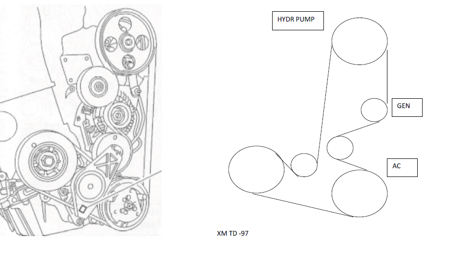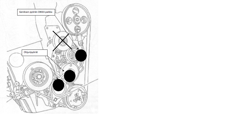 Eli tuo kuva jonka Laakeri laittoi on ihan käsittämätön sillä kun tein omastani korjaukset kuvan päälle niin tajuaa että hydepumpulta tuo remmi ei voi mennä suoraan alas kompuralle koska geniksen pyörä on oikeasti tasan samalla linjalla. Lisäksi kiristinpyörät ovat huimasti eri paikassa. Eli mun alunperin asentama remmi meni ihan oikein.