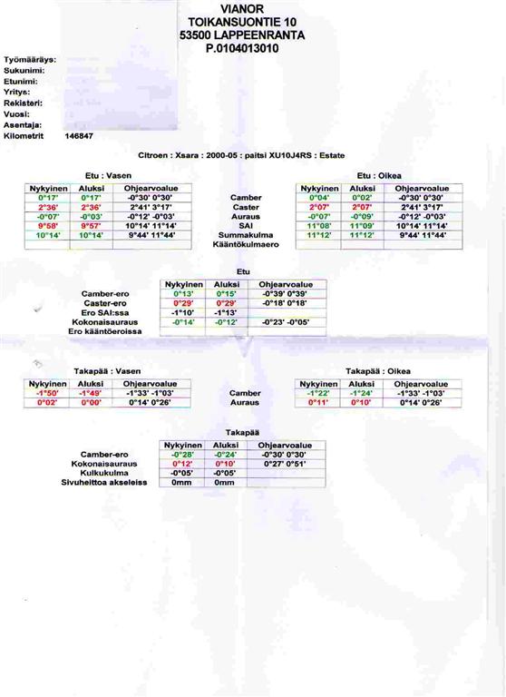 Toiseen raidetangonpäähän oli tullut välys, joten vaihdoin molemmat. Kun ei tullut sen kummemmin mitattua, ihan vaan silmällä laitettua, niin päätin viedä Xsaran oikein nelipyöräsuuntaukseen. Silmä oli näemmä tarkka, mutta muutenhan tuloslappu on punaista pullollaan.