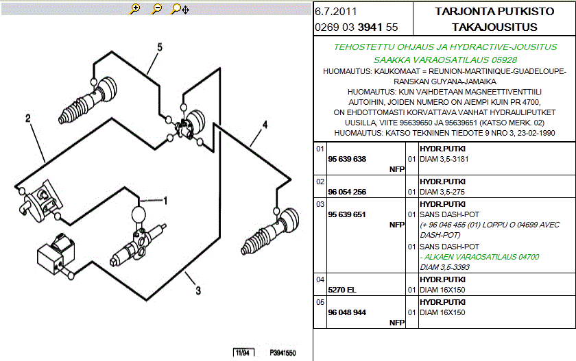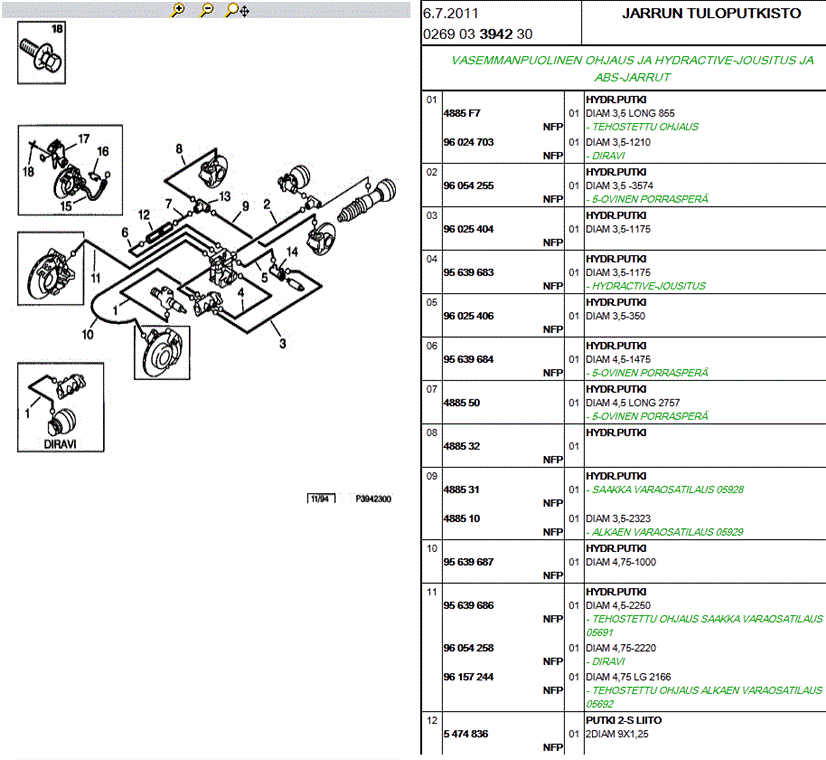 Hyvinkin on samannäköiset kuvat... Sit tuo mikä esim noissa takajousisylintereille menevissä putkissa/letkuissa on tekstinä, DIAM 16X150, se ei tietenkään tarkoita mitään tuohon putkeen eikä letkuun liittyen, vaan liittimen kierrettä joka on M16x1,5... Putki noissa on ulkohalkaisijaltaan 10mm, millin seinämällä, johon on prässätty samanoloista letkua kuin mitä löytyy vaikka traktoreiden hydrauliikkalaitteista. Nyt kun esim tuon oikeanpuoleisen jousisylinterin putki/letkuhässäkän kohdalla lukee NFP, niin sehän pitäis olla ns. tekemätön paikka kun se laukeaa, mutta pelastus löytyy tuosta kierretiedosta, joka on varsin yleinen mm. hydrauliikan liittimissä... Juu, on joskus vähän tullut selviteltyä, kun omasta meinas tulla ongelmaks...