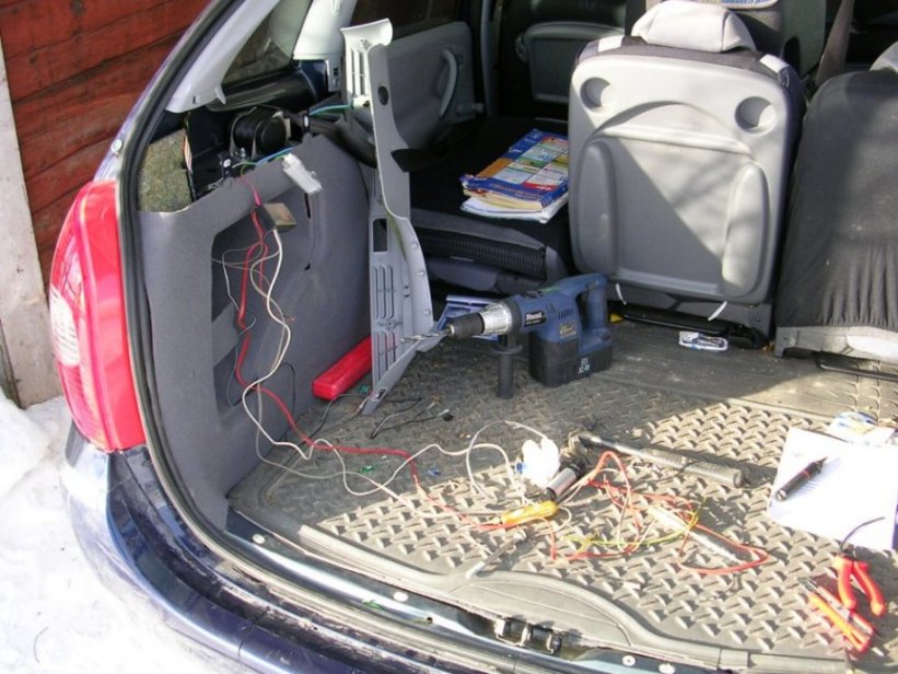 Lukon vieressä vasemmalla näkyy porattu reikä, josta johdot ujutetaan auton alle.