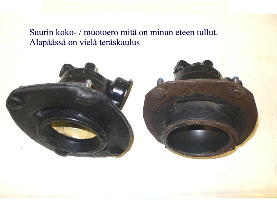 olli__o kirjoitti: Ehkä kumilla on saanut paremman kylmänpään kimmoisuuden, PU taitaa mennä Suomen talvissa välillä alle lasisiirtymälämpötilan (jos PU:lle sellaista on)? Latvialaiset kertovat modanneensa osaa siten ettei tule enää läpi vaikka irtoaisivatkin toisistaan ja korjaavansa vaikka alalevy olisi ruostunut. Olisikohan niillä joku korvaava uusi alaosa, huomasitko pascal kurkata sisään, oliko alapuoli uutta tavaraa? http://www.elastomer.eu/en/strut-mounts.htmlLainaa: Improved inside construction now preventing from splitting strut mount into two parts in case of elastomer failure. Eikös tämä firma ole Liettuassa, ainakin sinne minä paketin lähetin, Kaunakseen. Tuollaisen korjauksenhan ne myös tekee, sitä ei välttämättä kumminkaan taida silmällä nähdä. Tuolta French Car Forumilta bongasin tuollaisen kuvan mikä ilmeisesti esittää juuri tätä korjausta. Oikaiskoon joku viisaampi jos olen väärässä.