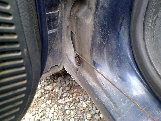 On se vaan peli, meinaan. Kaikki muoviosat, käkkärin vaijerin haitarit, suojaputket, jarrujen kulumisvarottimen johdot, klemmarit, kaikki sisälokasuojan osat ym. ovat aivan ehjät ja kaikki ruuvit ja mutterit on auennet kiltisti. Jotain jälkeä merkkihuollosta ja yhdestä omistajasta on nähtävillä.