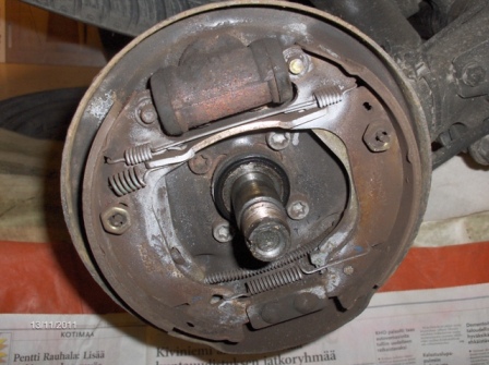 Mutta voi voi, olenko ymmärtänyt jotain väärin, vai onko kenkiä kiinni pitävät "rautalaula"-jousi-alumiinilevyhässäkässä joku niksi irrottaa/kiinnittä helposti, jota minä en keksinyt? Aika mahdoton systeemi yksin asennella. Säätyykö kenkien etäisyys alaosan ruuveilla ulkopuolelta? Nyt homma on purettu ja osien toiminta alkaa hahmottua. Käsijarruvaijerissa on tosiaan hienohampainen säätöhässäkkä, joka senkin toiminta vaatii sisäistystä. Katsastus pomppasi tod. näk. siihen, että sylinteri oli tihkunut jarrunestettä kengille ja rumpuun, ja pito oli heikko. Täytyy jatkaa huomenissa.