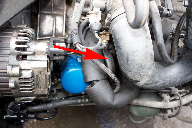 Tiedoston kommentti: Tässä tuo katkennut letku. Vieressä paistaa öljynsuodatin. Liekö tuossa vieressä (tai siis kuvassa letkun vasemmalla puolella) jonkin anturinkin liitin, sekin melkoisen öljyisenä. Mikähän se on?