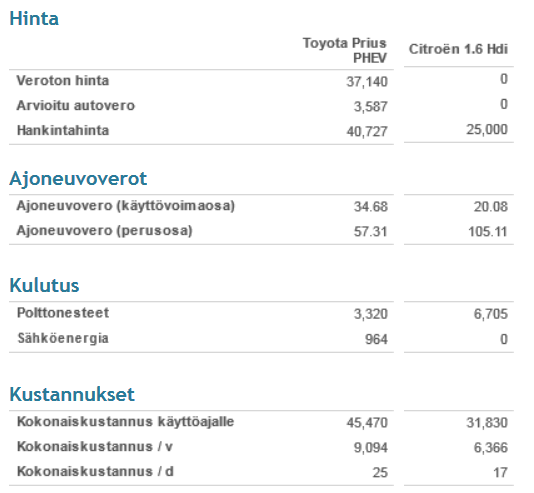 Ok, ilmeisesti olen tyhmä  , mutta en kyllä saanut laskuria toimimaan, vaikka kuinka kokeilin  . No tpisaalta nuo antamanne esimerkit jo näyttävät suuntaa. Tuossa ei ollut mukana huoltokustannuksia jotka lienevät näissä hybrideissä jaj sähköautoissa tavallista korkeammat Scrat