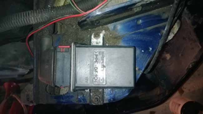 Nokassa, puskurin alle jäävä mötikkä, mistä lähtee johtosarja akun taakse.