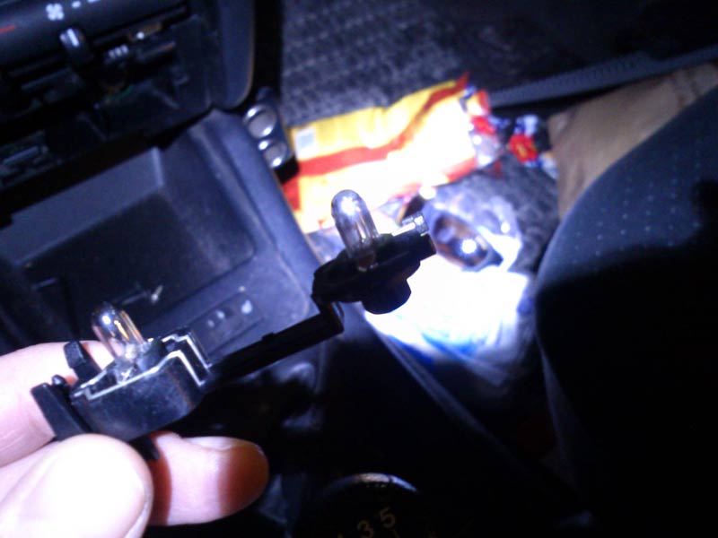 Ongin illan päälle lämppärin valot ulos myös. Ovat lyhyemmän mallisia kuin tuo kellon polttimo, joten saan uusittua ne vasta huomenna, jahka pääsen kaupoille. Lämppärin valot tuli ulos näppärästi. Radio pois, lämmityslaitteen konsolia ulos sen verran kuin sitä sai (eli mun tapauksessa ehkä jopa 1,1 cm) kansi päältä auki, ja valosydeemi oli etupaneelissa. Irtosi näpein helposti, mutta sen onkiminen ulos sieltä syövereistä onnistui vasta kun irrotin polttimoille menevän virtapiuhan. Myös lämppärin hanikoita piti vähän väännellä, että hammaspyörät siellä sisällä eivät estä valonkilkkeen ulostuloa. Laitetaas pari kuvaa näistäkin, josko jollekulle olisi asiasta joskus myöhemmin iloa. Tässä autossa näytti olevan sekä mittarin, kellon että lämppärin valot kaikki keskenään eri tyyppisiä. En tullut kokeilleeksi olisiko kellon valo mennyt mittaristoonkin, mutta ainakin ulkoisesti olivat erinäköisiä. Mittariston polttimon muovikanta oli suipompi, kun taas kellon polttimo oli neliskanttisempi, ehkä lyhyempikin tai sitten näköaisti huijaa.