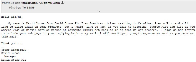 Päivän saldona on Davidilta tullut viesti, jossa hän kovasti haluaa ostaa jotain(!), mutta haluaisi maksaa Visalla tai Masterilla. Jännä juttu, että ostohalut ovat kovat, mutta ei tietoa siitä, mitä halutaan.