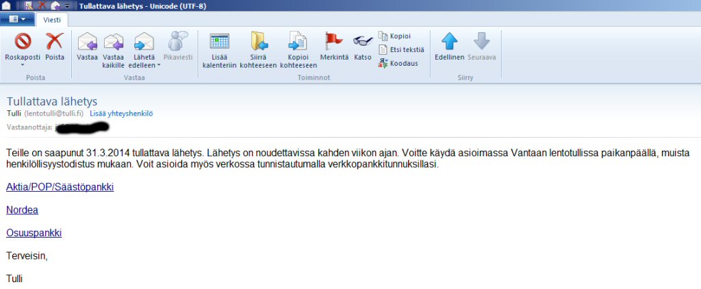 Tällainen muka tullista tullut viesti on myös tullut sähköpostiin jo pari kertaa. Pankkilinkeistä aukeaa aidon näköiset kirjautumissivut. Toki päälle aukeava webbihotellin mainos jo herättää huomiota, mutta kai näihinkin joku lankeaa.