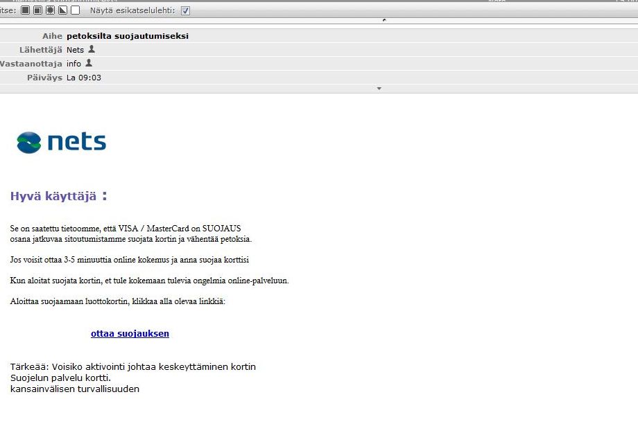 On fuulaa, tietojen kalastelua. Siinä kerrotaan mm., että tilini on tarkistettu ja ehkä käytetty luvattomasti toiselta tietokoneelta.......Pyydämme Sinua kirjautumaan heti......Älä paljasta salasanaasi......jne.