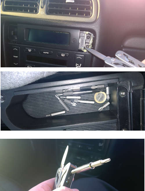 Koska ollaan kenttäoloissa ja telttamajoituksessa, työkaluvalikoima on vähäinen. Käytettävissä on vain Bahcon monitoimiveitsi sekä halpamarketista kahdella eurolla ostettu torx-pääsarja.