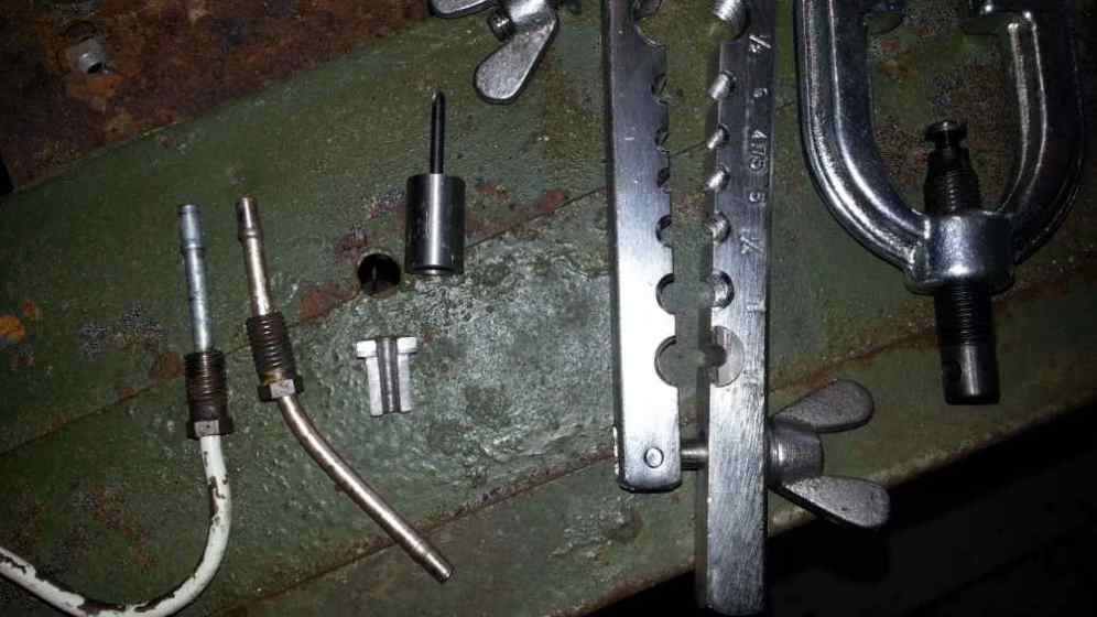 Mitä tehtiin: Haettiin mopiksesta jarruputkityökalu, joitain kymppejä. Vietiin alkuperäinen putki ja vermeet sorvaamoon. Selitettiin minkälaisen pään haluan tehtävän. Jarruputki työkalusta poistettiin kara päästä ja sorvattiin putken mittojen mukainen putken tekopää. Pyytämättä tekivät vastaholkin, joka käy alkuperäiseen työkaluun, näin hydrauliputkeen ei tule noita "hampaan" jälkiä. Itse vastaholkkia modaamalla putki pysyy nyt paikoillaan ilman ruustukkia ja eipä tuon plummin teko edes paljoa voimaa vaadi. Annettu sorvarille 40,- ja oisko ollu kolmisen kymppiä toi jarruputkityökalu, eli reilusti alle satasella voi saada täysin toimivan työkalun itselleen. (Vrt. kaupassa ns. oikea maksaa kolmisen sataa). Meinaan tehdä itselle kaikki putket uusiksi, tällä se onnistuu.