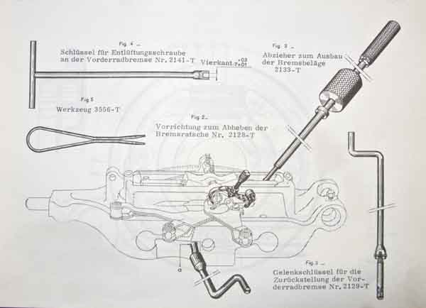 Tiedoston kommentti: Fig 4; Ilmaruuvin avain, Fig 2; jarruräikän irrotustyökalu?, Fig 2; jarrukengän ulosvetovasara, Fig 3; Nivelväännin jarrujen säätämiseen