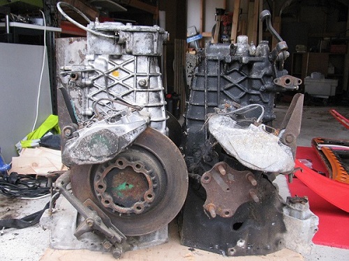 Siinähän ne on mahat vastakkain. Kuvista näkee selvästi, että neljä- ja viisivaihteisen laatikon silmiinpistävin ero on se, että nelivaihteinen on huomattavasti likaisempi.