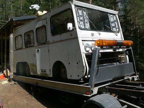 Juuh komeesti meni kyytiin otto, noin tunti tehtiin töitä, ja MKA oli lavalla  Ainoana siirrossa vaurioituneena osana oli toinen takatukijalka, joka vääntyi, kun ei sitä älytty ottaa ylös  Ja toisen puolen helmalista myös revittiin repsottavana pois hiukan väkivalloin.  Jos aikataulut passaavat voin osallistua purkutalkoisiin, ja kattopellit kelpaisivat ainakin minulle vallan mainiosti, jos ne saadaan jotenkin kivasti purettua, kokonaisena katon siirto taitaa olla melko mahdotonta, koska se on niin pirun pitkä (mittasikohan kukaan kuinka pitkä?) Noh on se ainakin 2m MKA:ta pidempi, että, jos saisi keskeltä kahtia, niin sopis autotraikulle. Kaipaisin maille autokatosta parin projektin suojaksi, ja tuo olisi siihen oikein kelpoinen  .
