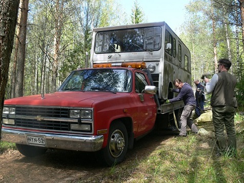 Eipä sitä siivousta ole kukaan vaatinut vaan luvattu, joten se hoidetaan. Se siitä. Homma meni kerrankin kuin Strömsössä, auto oli lavalla jo kun aikataulun mukaan hinurin piti saapua rikospaikalle. Tuo takatukijalka hieman harmittaa mutta oli niin pahassa paikassa vajarakennelmien piilossa, ettei huomattu ennen kuin oli myöhäistä. Hieno sydemi sinällään, auto yläasentoon, tukijalat lukitaan ala-asentoon ja auto takaisin alas ja avot, ei keiku, vaikka miten raskaasti nukkuisi. Hyvää jatkumoa MKA:lle ja sen toteuttajille. Tässä pari räpsäystä paskaisen uv-suojan läpi. Liitteet: