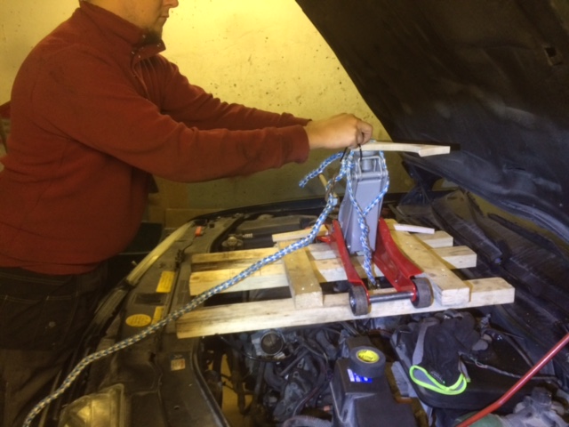 Kesällä kun vaihtelin 1.816V Xsaraan nokkahihna, vesipumpun yms., niin piti rakennella moottorituki, että sai moottorin kiinnikkeen irti. Kuvien mukaisen "härvelin rakentelin nurkissa lojuvista osista. Voi käyttää myös vaihdelaatikon tukemiseen tarvittaessa. Tuö metallitanko oli normaalia hyllytankoa, mutta neliöputki olisi vielä jäykempi. Sivutuet on kiinnitetty tukemisen ajaksi etuiskarin pulttien alle.