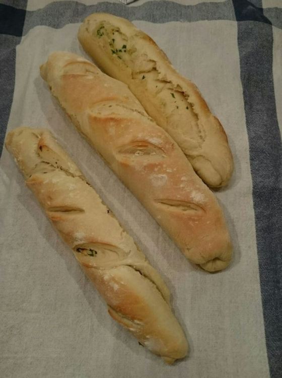 Patonkia! Yhdessä juustoa, toisessa valkosipuli-persiljavoi ja kolmannessa aurinkokuivattu tomaatti ja basilika. Nam.