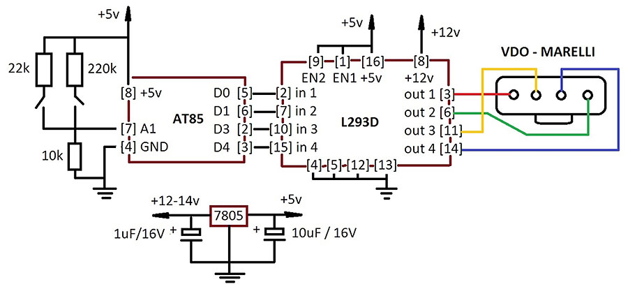 And to shrink little more the project: - Atmel tiny 85 (@ 16Mghz / 4.8V - PLL) - L293D - 10k , 22k, 220k - 2x push buttons - 7805 , 1uF , 10F caps Liitteet: