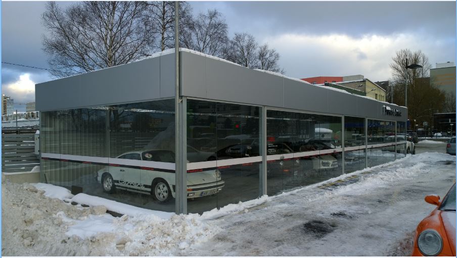 Tallinnan pörsse-kauppiaan pihanäyttelytalli. Siinä rivissä 50-120 tuhannen euron (veroton hinta) autoja. Tutkin rakennetta tarkemminkin ja se on mielenkiintoinen. Yksikertaiset lasit, katto pelkkä peltikehikko ja takaseinä samaten pelkkä aaltopelti. Teräsrunko. Ja sitten se olennainen: kuiva betonilattia ja 15 cm korkea koko tallin pituinen tuuletusaukko takaseinässä, näkyy kuvassakin hyvin. Liekkö katossa vielä erikseen tuuletusräppänöitä, ei nähnyt sitä ulkopuolelta. Säilyykö tuollaisessa klassikkoautot kunnossa, kuivana, ja lahoamattomana ympäri vuoden? Jos vastaus on ei, miten tuo sitten pitäisi tehdä? Lämpimän tai puolilämpimänkään säilytystilan rakentaminen ei ole vaihtoehto, ja lisäksi minua viehättää tuo lasirakenne sinänsä.