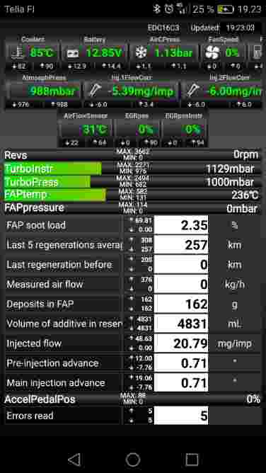 Saattaa se toimiakin. Tuo FAPpressure voisi toimia aika hyvänä indikaattorina FAPin kunnosta. Jos vastapaine on korkea, niin suodatin on tukossa. Mitä tuohon Eolys nesteen vähyyteen tulee, niin olikos se niin, että polttoaineeseen sekoittuva eolys neste sitoutuu paloprosessissa muodostuviin pienhiukkasiin ja myöhemmin hiukkassuodattimen puhdistuksessa alentaa hiukkasten hajoamislämpötilaa. Eli vaikka neste olisi loppu, niin hiukkasten poltto saattaa silti onnistua, vaikkakin huonommin. Voisi myös selittää miksi pönttöön on alkanut kertyä tavaraa. Tämä nyt oli sitten ihan spekulaatiota