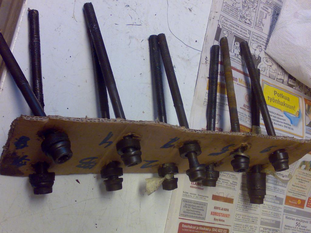 Tuli 400000 km koneella täyteen ja piti ottaa kansi irti koneesta tyhjäkäyntiongelmien vuoksi. Tiiviste olikin vähän heikossa kunnossa. Kun irroittelin kantta niin huomasin , että kannen 5 pultti oli jostakin syystä erilainen kuin muut.