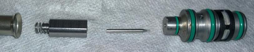Venttiilin siivilöin varustettu sisäelin jäi sisään. Sen tosin sai pyöreäkärkisillä pihdeillä noukittua ulos ilman jälkien jättämistä metalliosiin tahi vihreiden O-renkaiden rikkomista. Tässä vaiheessa piti pitää kieli keskellä suuta jottei n. 2 x 20 mm neulaventtiili häipyisi.