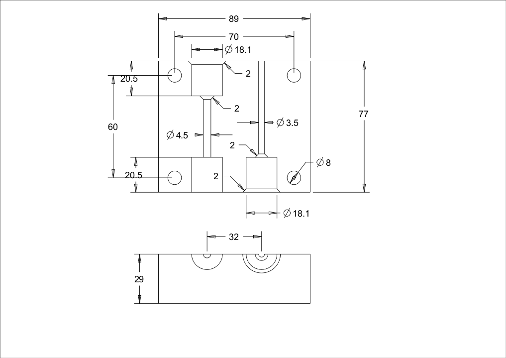 Ei oikein kuvasta selvinnyt minkä pituisia pultteja tai viisteitä käytit, laitoin tähän omaa silmää miellyttävän mittaiset. Lähinnä periaatekuvahan tämä vain on, vaikka toki näilläkin mitoilla toimivaa tulee. Ja noita viisteitähän saa myöhemminkin suurennettua, kuten teitkin jo. Joitain epäoleellisia mittoja jätin merkitsemättä.