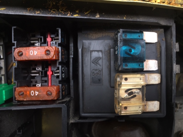 7.) Vielä kerran moottoritilan pikkusulakkeet yksi kerrallaan irti ja päivänvalossa tarkastaen, ovatko ehjiä. Kaikki olivat OK, ei sulamisia eikä tummumisia. Samoin sulakerasian liittimet sulakkeiden alla eivät olleet mustuneet tms. WD olinkin jo laittanut taannoin liittimiin just in case.