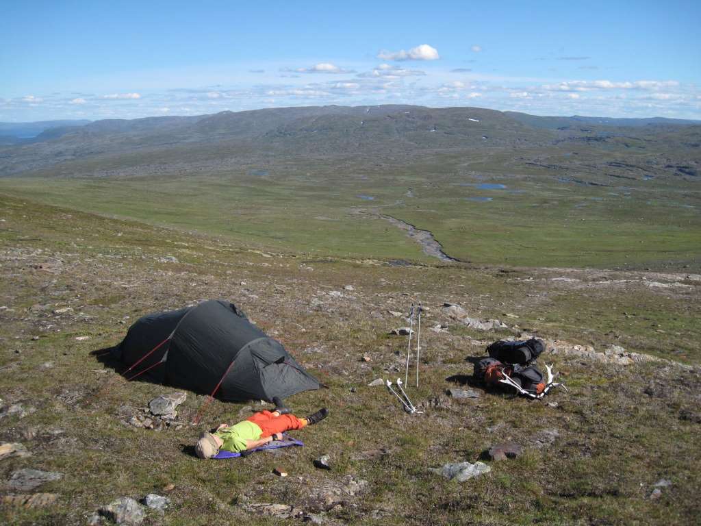 Kuvassa ovat teltta ja ACRy:n rahastonhoitaja tunturin rinteellä.