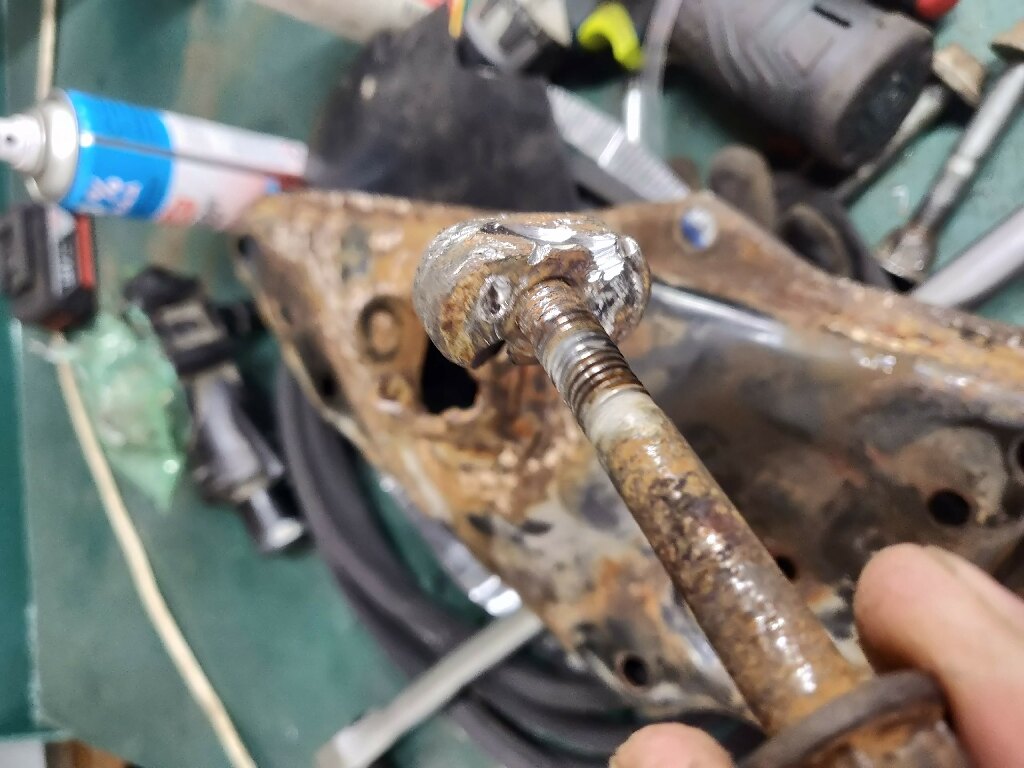 Pitää tulevia irrotuksia varten tehdä iskarinyläpäähän uusi mutteri. Etsin sopivan teräspalikan, ehkä 10 cm pituisen ja hitsaan uuden mutterin sen päähän kiinni, jolloin noin pitkä vipu ei pääse pyörähtämään tuon pohjakotelon ja tukipellin välissä. Jos sitten joskus on kierteet jumissa, niin puupalikka tämän teräspalikan ja rungon peltien väliin ja eikun kiertämään pulttia auki.