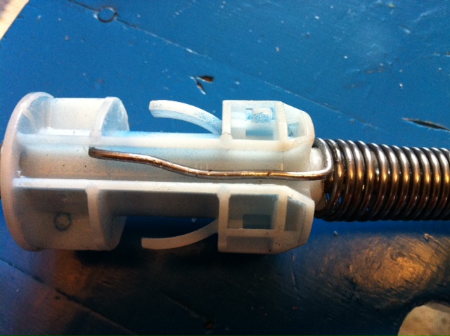 Sieltäpä putken sisältä löytyi ihan tavallinen rullaverhon mekanismi. Kuvia korjausoperaatiosta en hoksannut ottaa enkä kyllä oikeastaan tiedä mitkä työvaiheet oli loppupelissä pakollisia ja mitkä ei. Riittää kun purkaa verhosta sen päädyn jossa on kannakkeessa sokalle reikä. Sieltä pitää kaivaa päätytulppa sisälmyksineen ulos runkoputken sisältä. Omassani oli vikana että jousi oli päässyt karkuun päätykappaleesta eikä tuommoisessa nyt oikein muuta vikaa osaa ollakaan.