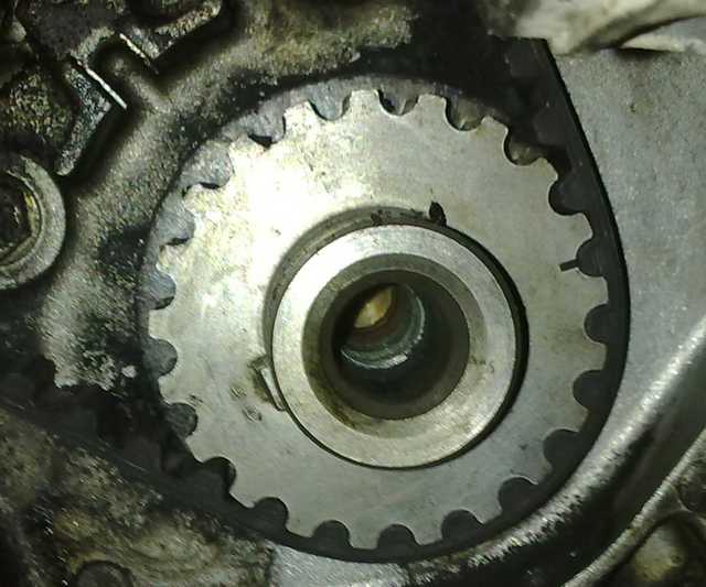 Laitetaan nyt kuviakin, kertovat enemmän kuin 1000 sanaa. Kone on siis 8 venttiilinen. Tuo koken mainitsema millin miinustus täsmää aika hyvin tuohon raaputettuun merkkin. Taidanpa luottaa siihen ja laittaa hihnan sen mukaan. Hihnapyörän ajoitusreikä on aika tarkkaan 180 astetta pielessä, mikä hieman ihmetyttää, jos siirtymä on tullut luistamalla. Hihnapyörähän voi olla vaihdettu, mutta onko niitä sitten kuinka erilaisia.